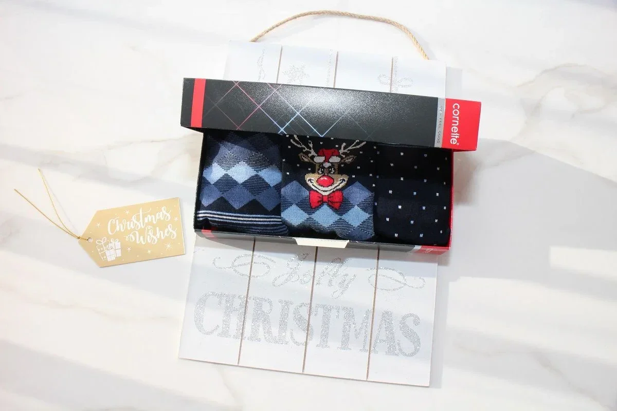 Blíží se svátky, a tak pro své blízké ulovte tuto jedinečnou trojici pánských ponožek od známé značky Cornette. V nápadné krabičce se sklem najdete tři páry v tmavě modré barvě - dva se světlým vzorem, třetí se známým sobem Rudolfem. Vysoce kvalitní, měkké povrchy, odolná struktura a ploché, pohodlné švy.