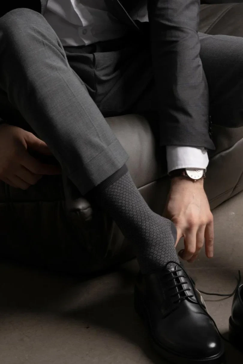 Pánské ponožky STEVEN 011 jsou elegantním a pohodlným doplňkem každého oblečení. Jemný kosočtvercový vzor jim dodává klasický, stylový vzhled, který se skvěle kombinuje s oblekem i každodenním oblečením. Jsou vyrobeny z vysoce kvalitní bavlny se směsí polyamidu a elastanu a zaručují prodyšnost, pružnost a odolnost. Bezešvá konstrukce a netlačící pásek zajišťují maximální pohodlí a eliminují riziko otlaků a odřenin. Perfektně se hodí pro každou příležitost, ať už do práce nebo na společenské akce.