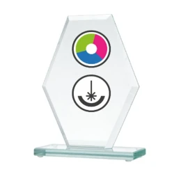 Skleněná trofej s barevným potiskem LuxorJet, gravírováním a inkoustovou výplní