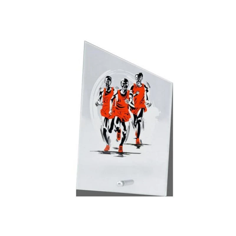 Trofej ze skla s kovovou podložkou s motivem maratonu. Na desku je možné provést rytinu - doplňková služba (cena závisí na ploše potisku).