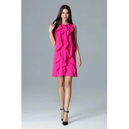 Trapézové šaty bez rukávů se svislými volány. Model bez kapes, bez podšívky, ušitý ze skvělého materiálu dodá lehkost a šik každému stylingu. Skvělá volba pro ženy, které si cení elegance.