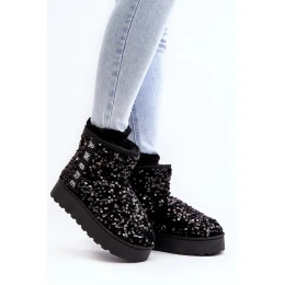 Dámské sněhule zdobené flitry. Uvnitř zateplené silnou umělou kožešinou. Osazené na silné platformě z gumového materiálu, která dokonale izoluje od chladné země. Svršek v délce nad kotníky. Módní na několik sezón, skvěle se hodí do podzimních a zimních stylizací!