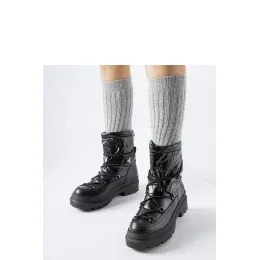 Černé sněhule s lemováním Eagleville jsou skvělé zimní boty vyrobené z vysoké kvality gumy, která zaručuje odolnost a ochranu před vlhkem a sněhem. Jejich kulatý nos zajišťuje pohodlí a neomezuje pohyb nohou. Navíc plochý podpatek zaručuje pohodlí při dlouhých procházkách. Tyto módní boty jsou ideální volbou pro ty, kteří hledají spojení stylu a funkčnosti. Zapínání na zip usnadňuje jejich obutí a černá barva podrážky dodává eleganci. Sněhule Eagleville jsou must-have na nadcházející podzimní a zimní období.
