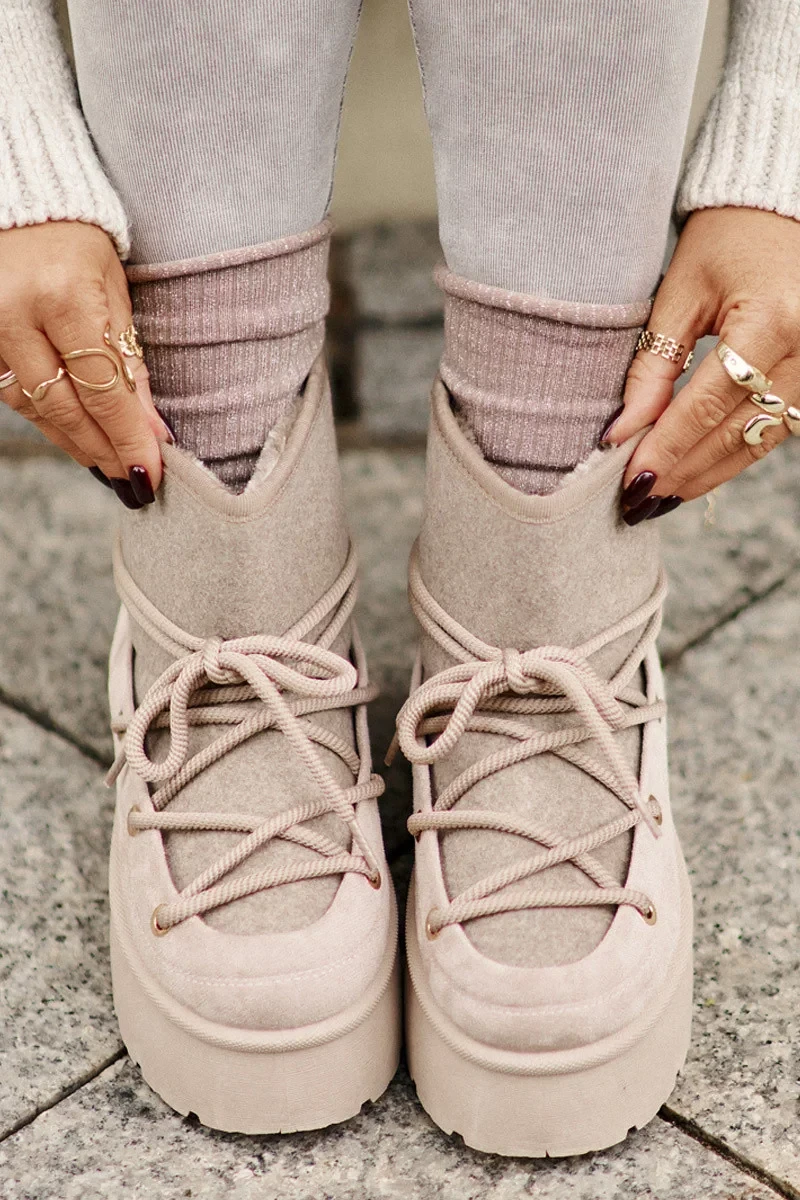 Stylové sněhule na platformě jsou ideální kombinací módy a pohodlí. Mají praktické šněrování vpředu, které zajišťuje dobré přizpůsobení noze. Vnitřek zateplený kožíškem zaručuje teplo v mrazivých dnech. Pohodlné a teplé, skvěle se hodí jak na každodenní nošení, tak i na zimní procházky. Při výběru velikosti se prosím řiďte tabulkou velikostí.