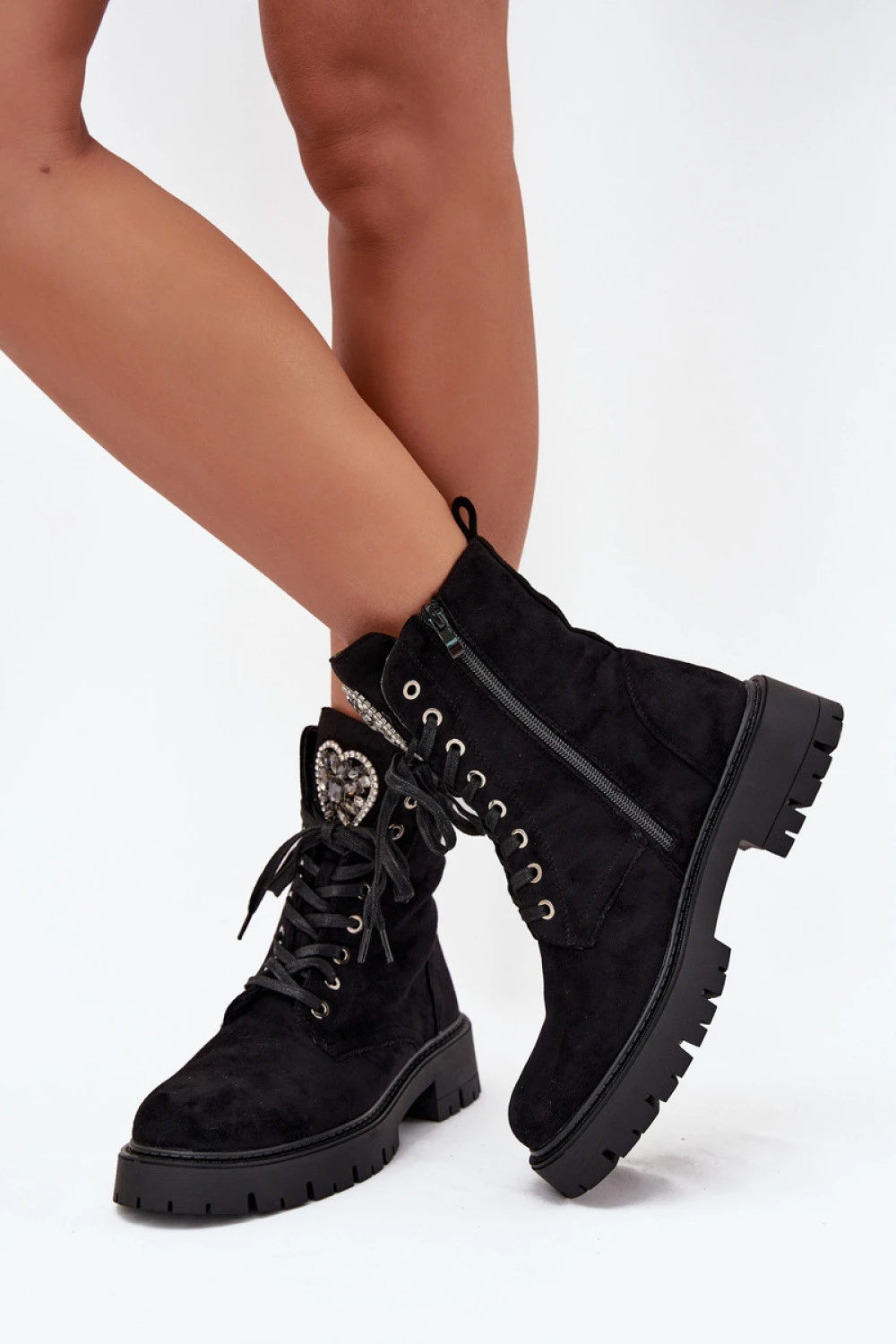 Polobotky vyrobené z ekokožešiny jsou módní a pohodlnou volbou na podzim a zimu. Vyztužené vnitřním polstrováním zaručují teplo a pohodlí v chladnějších dnech. Šněrování vpředu a dodatečný zip na boku zaručují snadné přizpůsobení a pohodlné obouvání. Díky nízkému podpatku a platformě poskytují stabilitu po celý den. Bižuterní ozdoba na jazyku dodává elegantní akcent. Tyto polobotky skvěle ladí s různými styly, a jsou skvělou volbou na podzimní a zimní období.