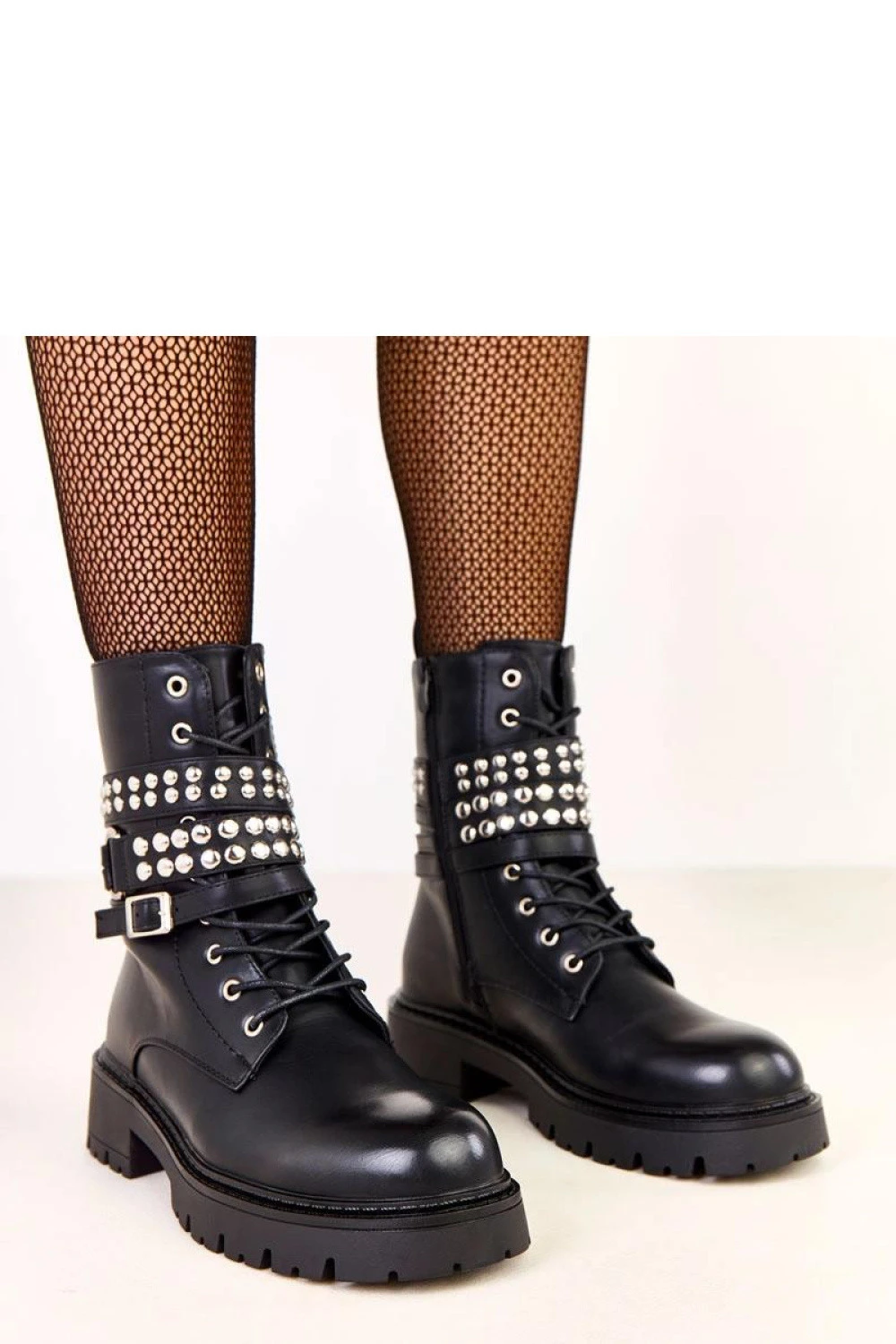 Kozačky s přezkou a ozdobnými pásky s jetemi jsou spojením městského stylu, pohodlí a módních detailů. Vyrobené z ekologické kůže vypadají moderně, a pásky s jetami jim dodávají charakter a rockový akcent. Model má kulatou špičku a je vyztužený, což zajišťuje termální pohodlí i v chladné dny. Šněrování vpředu ve spojení s přezkou umožňuje ideální přizpůsobení noze a pohodlné obutí. 5 cm vysoký podpatek stabilně drží nohu, a vysoký 18 cm nárt chrání kotník a dodává postavě módní, masivní vzhled. Vložka z umělé hmoty zajišťuje trvanlivost a pohodlí při nošení.