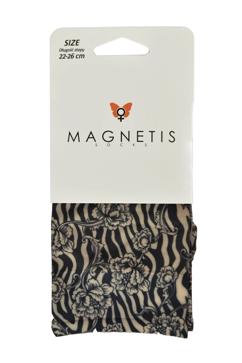 Postaw na oryginalne połączenie klasyki i ekstrawagancji z wyjątkowymi skarpetkami Magnetis 15 DEN. Wzór łączący motyw kwiatów z paskami zebry tworzy niepowtarzalny efekt, który nadaje stylizacji charakteru i wyrazistości. To idealny wybór dla kobiet, które lubią bawić się modą i stawiają na dodatki, które przyciągają spojrzenia.Delikatna tkanina o grubości 15 DEN zapewnia subtelny wygląd, a dzięki elastycznemu połączeniu poliamidu i elastanu skarpetki są wygodne, trwałe i idealnie dopasowują się do stopy. Stylowy detal, który doskonale sprawdzi się zarówno w casualowych, jak i eleganckich zestawach.