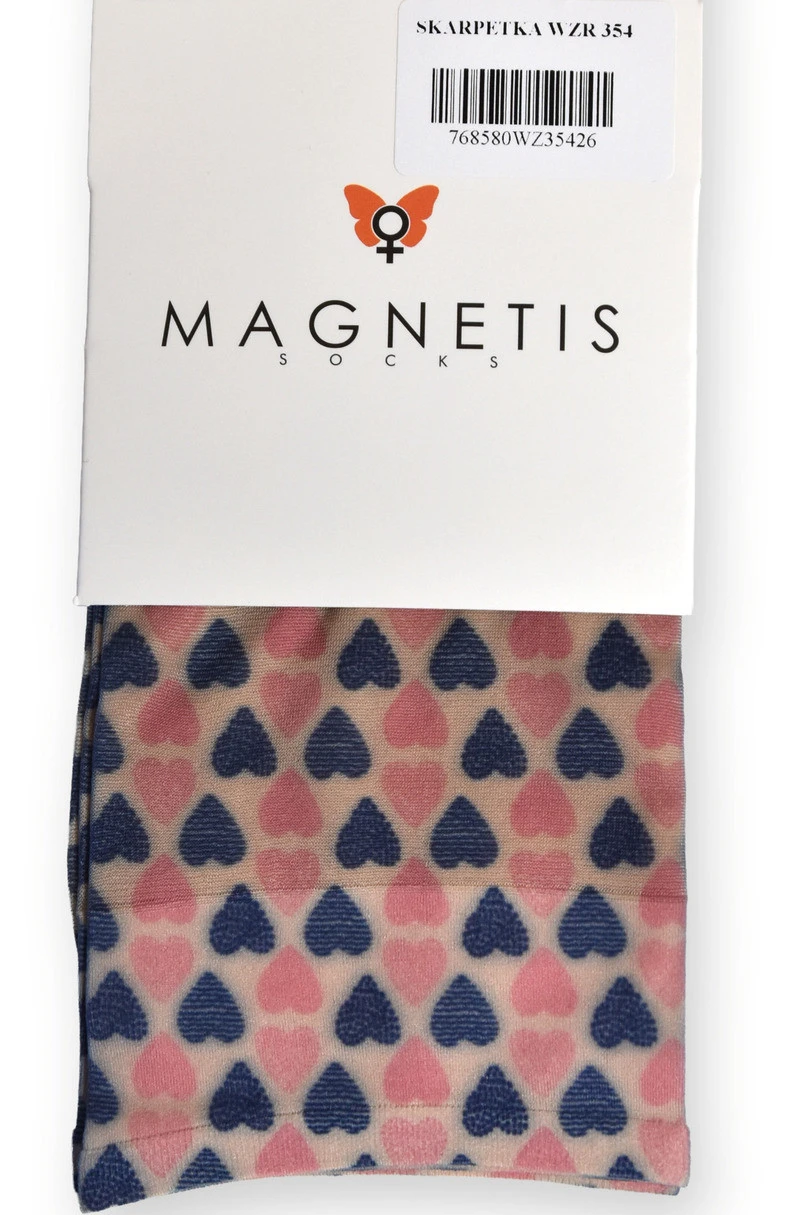 Dodejte svému outfitu roztomilý a ženský nádech s ponožkami Magnetis WZR 354 se vzorem . Béžový podklad zdobený motivem srdíček v růžové a tmavě modré barvě vytváří romantický a módní vzor, který dodá charakter každému outfitu. Ponožky jsou vyrobeny z vysoce kvalitního 88 % polyamidu a 12 % elastanu, což zajišťuje jejich výjimečnou měkkost, pružnost a dokonalé přilnutí k noze. Perfektně se hodí jak na každodenní nošení, tak jako roztomilý doplněk k ležérním outfitům.