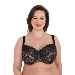 Cała miseczka wykonana jest z efektownej, czarnej koronki o kwiatowym wzorze, która dodaje bieliźnie wyjątkowego uroku i zmysłowości. Dolna część miseczek podszyta została elastyczną dzianiną, a wnętrze wykończone delikatną bawełną, która jest przyjazna dla wrażliwej skóry. Fiszbiny boczne zapobiegają zwijaniu się materiału i podnoszą komfort noszenia. Szerokie, regulowane ramiączka doskonale podtrzymują biust bez ucisku.