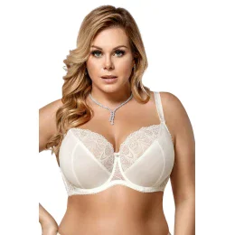 Vynikající, měkká podprsenka pro ženy. Košíčky dobře sbírají poprsí a udržují ho na místě, přičemž krásně odhalují dekolt. Spodní část košíčků je vyrobena z hladké pleteniny. Horní část košíčků, můstek a boky jsou vyrobeny z krásné krajky, lemované jemnou síťovinou. Malá mašlička uprostřed s bižuterní ozdobou. Košíčky jsou tvarované drátkem kolem prsou. Díky tomu jsou prsa dokonale shrnutá dovnitř, zvednutá a udržují si krásný, zaoblený tvar. Široké boky z pevného lycrového úpletu, navíc opatřené svislým podšitím, zajišťují, že podprsenka zůstane na svém místě.