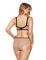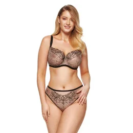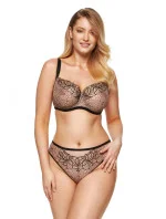 Dámská měkká podprsenka z tylu a orientální vzorované plisované látky, která je určena pro velká prsa. Třídílné měkké košíčky. Část košíčku je zevnitř vyztužená elastickým tylem. Nastavitelné, neodnímatelné ramenní popruhy, široké ve velkých velikostech. Svislé boční velrybí kosti zabraňující bočnímu rýhování.