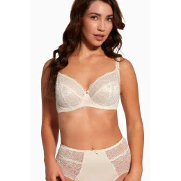 Svůdný krajkový návrh v krásné béžové barvě. Střih se středně vysokým středem a trojitým vykrojením na košíčku. Dokonale drží a pozvedá poprsí a dodává mu přirozený tvar. Zdůrazňuje výstřih ve tvaru tulipánu. Horní část košíčků je podšitá elastickou síťovinou. Side Support - boční výztuž košíčku, která dokonale shrnuje a tvaruje prsa. Podprsenka nemá boční velrybí kostice. Nastavitelná ramínka odolná proti natažení a deformaci. Stylové kovové doplňky stříbrné barvy neobsahují nikl.