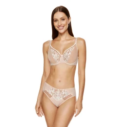 Elegantní měkká podprsenka určená pro střední až velké velikosti. Poloprůhledné košíčky z originální kombinace tylu a kontrastní výšivky. Střed zdobí půvabné mašličky. Zadní díl z tylu. Šířka ramínek se zvětšuje s velikostí podprsenky. Svislé boční velrybí kostice stabilizují obvod podprsenky. Podprsenka navržena a ušita v Polsku.