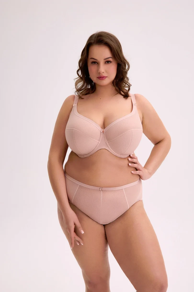 Biustonosz modelujący z fiszbinami, zaprojektowany z myślą o kobietach ceniących wygodę i elegancję. Wykonany z wysokiej jakości, oddychającej tkaniny o subtelnym prążkowaniu, doskonale dopasowuje się do sylwetki. Usztywniane miseczki na fiszbinach zapewniają optymalne podtrzymanie i atrakcyjne uniesienie biustu, podkreślając jego naturalny kształt. Szerokie, regulowane ramiączka gwarantują komfort przez cały dzień, eliminując nacisk i przeciążenie ramion. Minimalistyczna ozdoba między miseczkami dodaje całości delikatnego, kobiecego akcentu. Idealny wybór na co dzień i na specjalne okazje.