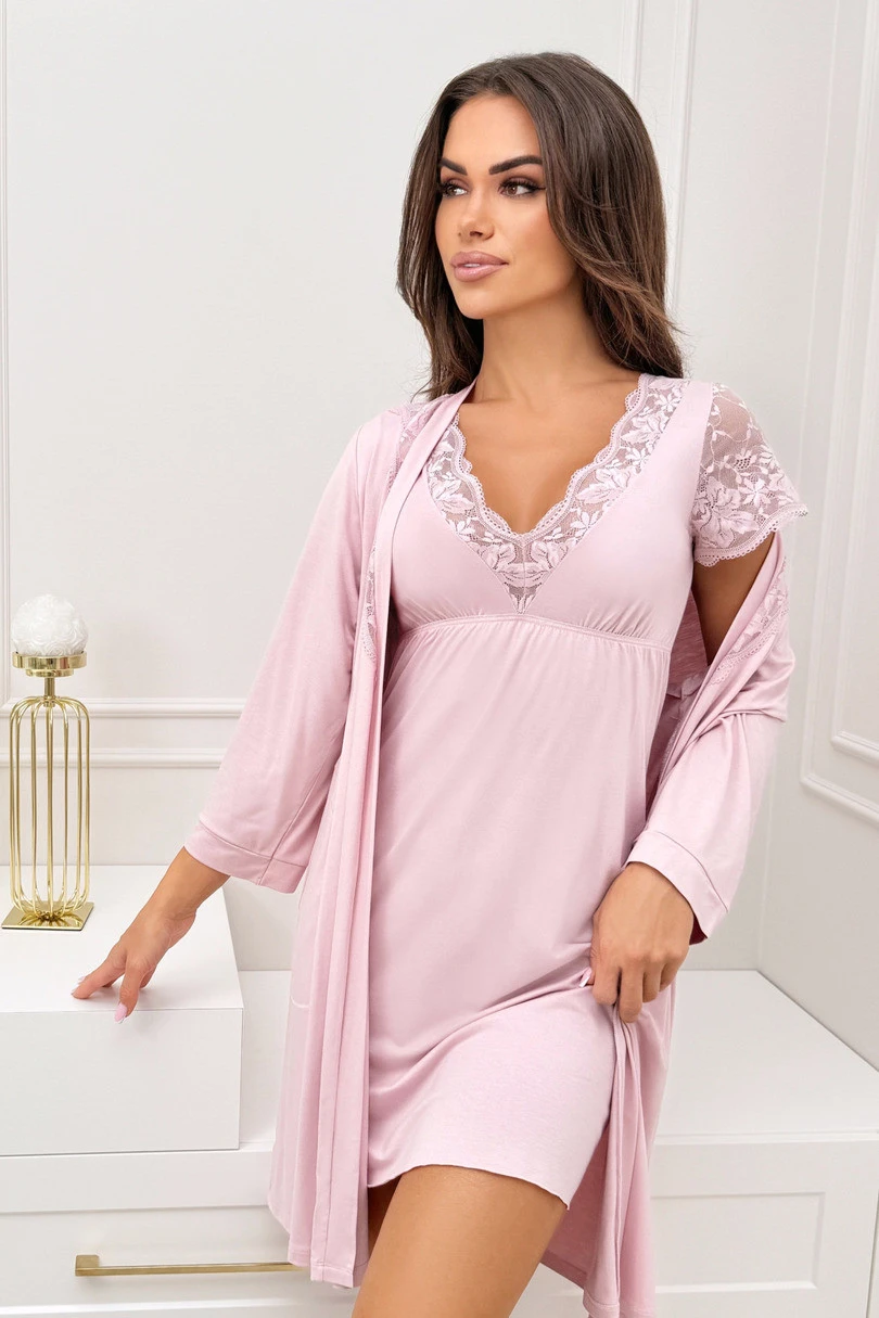 Noční košilka SONIA je spojením ženské elegance, pohodlí a vysoce kvalitních materiálů. Je vyrobena z měkké, prodyšné viskózy, dokonale se přizpůsobuje siluetě a zajišťuje pohodlný spánek. Jemná krajka ve výstřihu a na zádech ve tvaru písmene V decentně zdůrazňuje ženskost a dodává celku smyslný charakter. Krátké, krajkové rukávy a elastický pásek pod prsy s mírným řasením zaručují dokonalé přizpůsobení košilky a volnost pohybu. Díky délce pod kolena je model SONIA praktický a zároveň mimořádně stylový - ideální pro spánek i večerní domácí relaxaci.