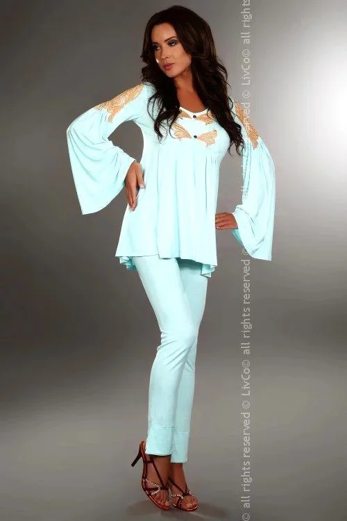 Dámské pyžamo Chloe LivCo obsahuje halenku s dlouhými rukávy, ozdobená hnědým vyšíváním volnějšího střihu. Dlouhé kalhoty upnutějšího střihu. Materiálové složení: 94% Viskoza, 6% Elasten. Barva: světle modrá. Velikost: S, M, L, XL.