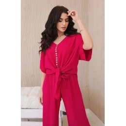Italský komplet s halenkou zavazovanou vpředu a širokými kalhotami je ideální volbou pro ženy, které ocení pohodlí a styl vjednom. Halenka se zapíná vpředu na knoflíky, což jí dodává jemnou ženskost. Široké kalhoty z tkaniny příjemné na dotek pro volnost pohybu a pohodlné nošení. Takovou kompletní sadu můžete nosit při různých příležitostech - do práce, na rande nebo na setkání s přáteli. V kombinaci s elegantními botami a doplňky, jako je kabelka nebo šperky, vytvoří stylový a módní vzhled. Velikost je univerzální a vyhovuje dámám velikosti S, M nebo L.