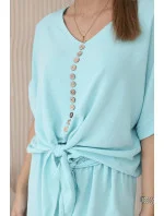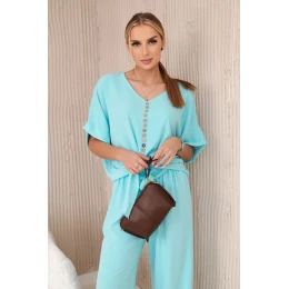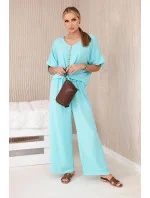 Italský komplet s halenkou zavazovanou vpředu a širokými kalhotami je ideální volbou pro ženy, které ocení pohodlí a styl vjednom. Halenka se zapíná vpředu na knoflíky, což jí dodává jemnou ženskost. Široké kalhoty z tkaniny příjemné na dotek pro volnost pohybu a pohodlné nošení. Takovou kompletní sadu můžete nosit při různých příležitostech - do práce, na rande nebo na setkání s přáteli. V kombinaci s elegantními botami a doplňky, jako je kabelka nebo šperky, vytvoří stylový a módní vzhled. Velikost je univerzální a vyhovuje dámám velikosti S, M nebo L.