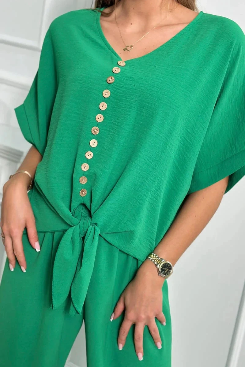 Italský komplet s halenkou zavazovanou vpředu a širokými kalhotami je ideální volbou pro ženy, které ocení pohodlí a styl vjednom. Halenka se zapíná vpředu na knoflíky, což jí dodává jemnou ženskost. Široké kalhoty z tkaniny příjemné na dotek pro volnost pohybu a pohodlné nošení. Takovou kompletní sadu můžete nosit při různých příležitostech - do práce, na rande nebo na setkání s přáteli. V kombinaci s elegantními botami a doplňky, jako je kabelka nebo šperky, vytvoří stylový a módní vzhled. Velikost je univerzální a vyhovuje dámám velikosti S, M nebo L.