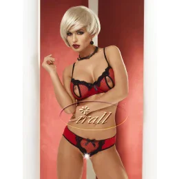 Extrémně sexy komplet s podprsenkou s otevřenými středovými košíčky a kalhotkami s otevřeným rozkrokem, vyrobený z červené elastické kabaretní látky, na okrajích zdobený krásnou černou krajkou. značka Irall. složení: 44 % polyamid, 39 % viskóza, 17 % elastan.