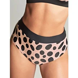 Spodní díl dámských plavek značky Panache. Kalhotky jsou vysoké, černý pás a béžové kalhotky s černými puntíky. Celopodšíté.