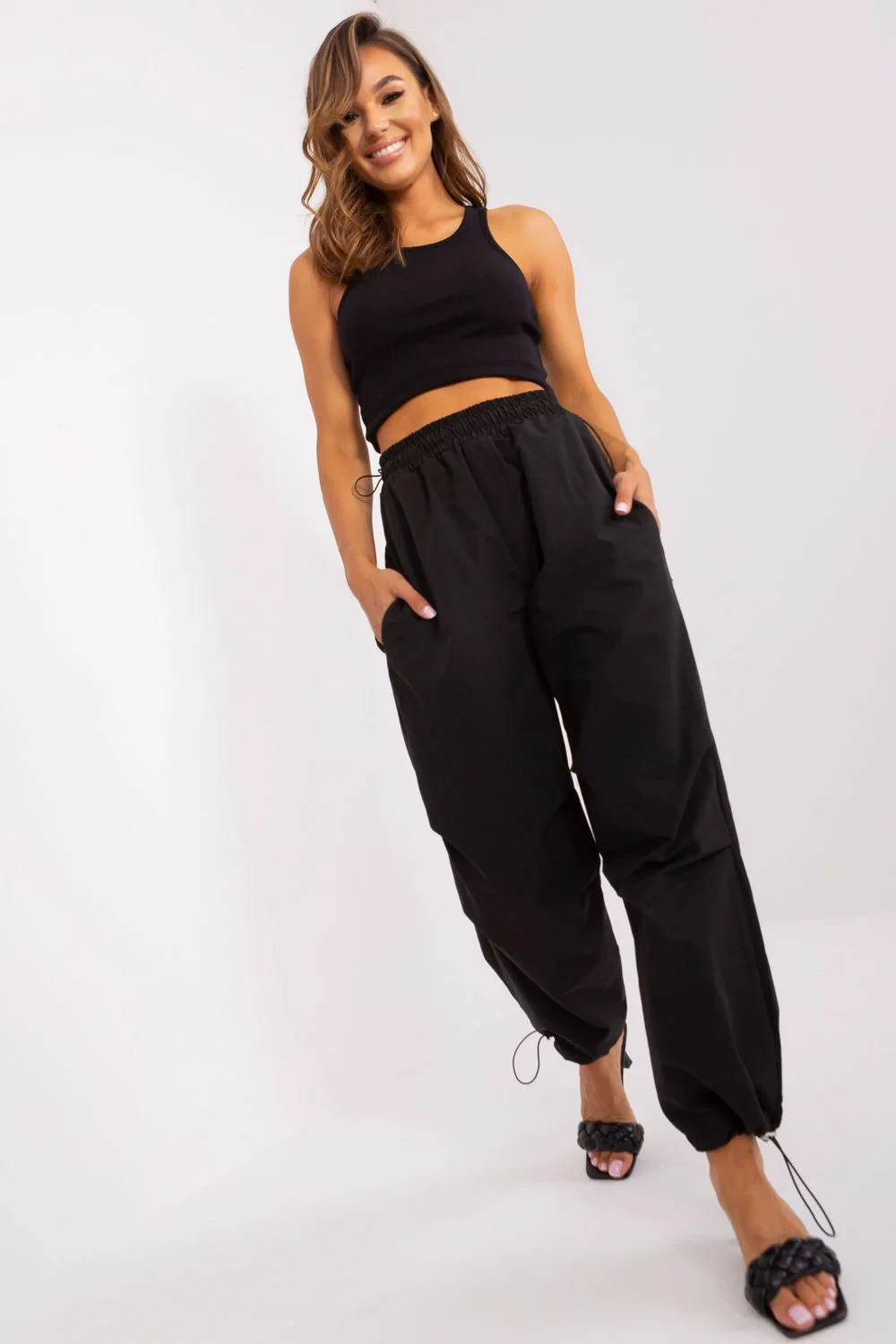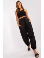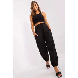 Kalhoty s volnějšími nohavicemi padákového typu. Stahovací šňůrka v pase a na spodním lemu. Kapsy na bocích.