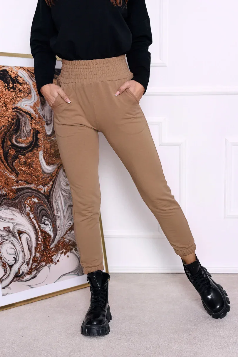 Dámské tepláky, délka nohavic 7/8, žebrované manžety, dvě kapsy na přední straně, široká ozdobná guma v pase.
