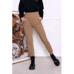 Dámské teplákové kalhoty. Model má nohavice v 7/8 délce se stahovacími lemy. Ve přední části jsou dvě kapsy a v pase široká ozdobná guma.