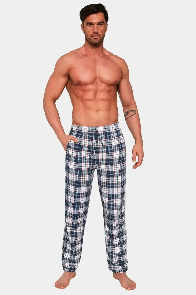 Pánské dlouhé kalhoty na spaní, s kapsami. Vyrobené z kvalitní bavlny, v pase do gumy lemované bavlnou a s přídavnou šňůrkou pro nastavení obvodu.