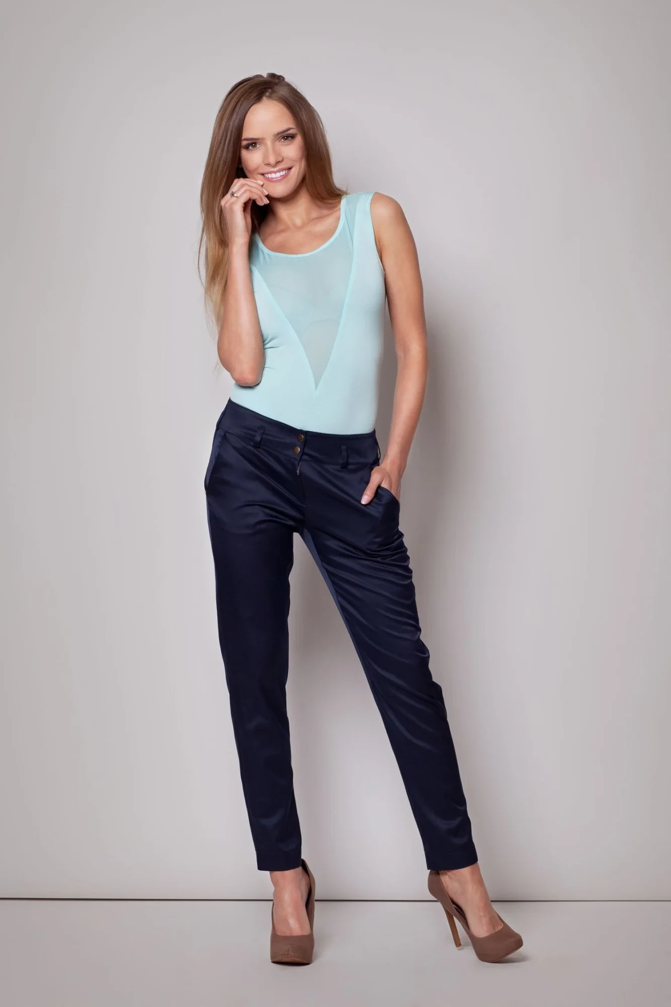 Elegantní a zároveň módní kalhoty, ideální do práce i na večer, s vyšším sedem, zapínáním na patentky, perfektním střihem, dvěma kapsami a poutky na pásek.