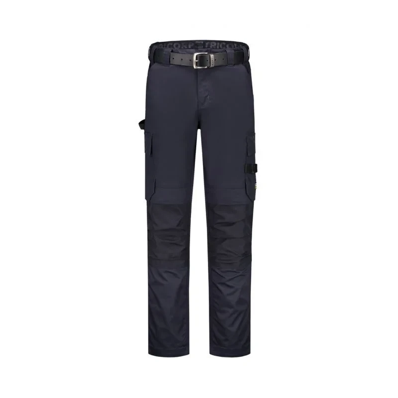 Unisex kalhoty elastický pas, multifunkční kapsy, reflexní prvky, kolena zesílená extra pevným materiálem CORDURA®, možnost prodloužení nohavic, vhodné pro kolenní chrániče T90, velikosti 45, 47, 49, 51, 53, 55 jsou prodloužené, pásek není součástí sady, kód produktu Tricorp: 502021
