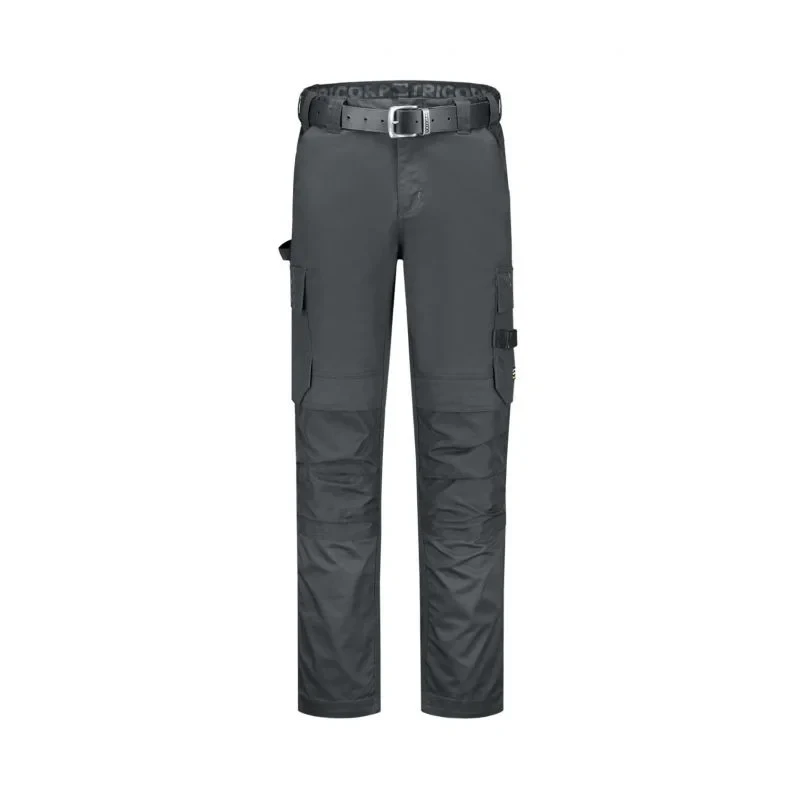 Unisex kalhoty elastický pas, multifunkční kapsy, reflexní prvky, kolena zesílená extra pevným materiálem CORDURA®, možnost prodloužení nohavic, vhodné pro kolenní chrániče T90, velikosti 45, 47, 49, 51, 53, 55 jsou prodloužené, pásek není součástí sady, kód produktu Tricorp: 502021