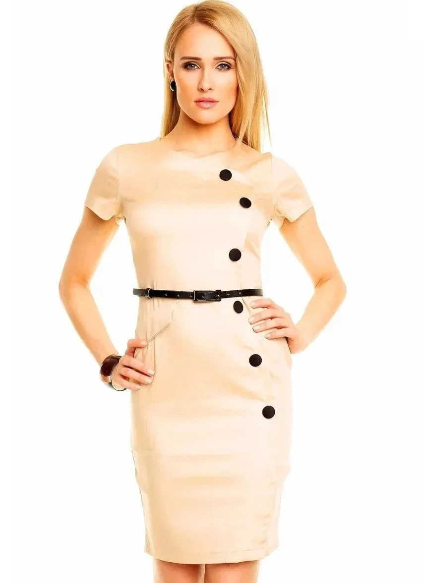 Společenské a casual šaty MAYAADI zdobené knoflíky a páskem béžové