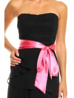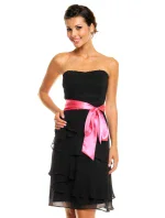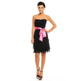 Společenské šaty a plesové šaty korzetové značkové Mayaadi, tento modelu šatů je zajímavý především výraznou černou mašlí v pase a také nepřehlédnutelným zdobením sukně. Mašle je součástí modelu a není ji možné ze šatů sejmout. Korzetový výstřih je oblíbený především pro společenské události. V zadní partii je v horní části silikonový proužek, který pomáhá udržet šaty na postavě. V oblasti prsou je polstrování a vertikální výztuhy. V zadní partii je do šatů všitý skrytý zip. V šatech je také v obvodu prsou pružná guma, aby v této partii šaty správně sedly. Model je sestavený z podšívky a vrchního dílu ze šifónu. Šaty je možné využít pro formální a slavnostní chvíle, můžete si je vzít do jakékoliv společnosti, formální i neformální, do divadla, na plesy, rauty, oslavy, na slavnostní oběd či večeři, oslavu narozenin, na párty, nebo na romantické rande s přítelem či manželem. Šaty jsou pohodlné na nošení, jsou vyrobené z na dotek příjemného materiálu.
