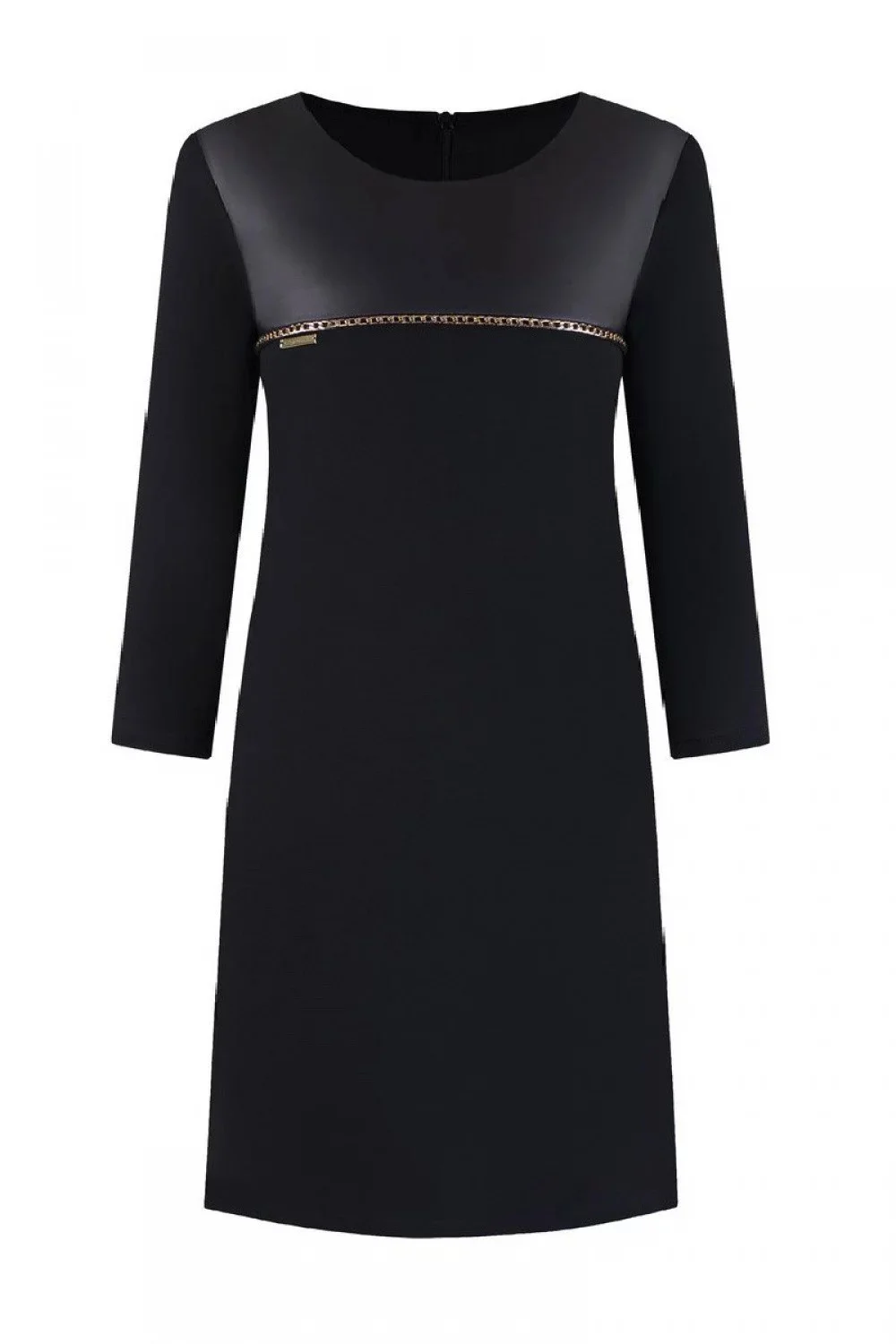 Šaty rovného střihu v černé barvě. Imitace kůže na přední straně, ozdobný řetízek na poprsí. Zip na zadní straně.