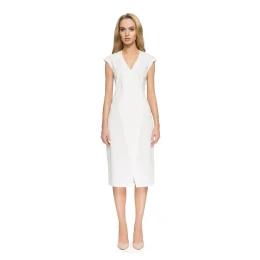 Ostré střihy a vypasovaný střih zdůrazňují ženské křivky a přitahují pozornost k těmto originálním šatům s ozdobnými knoflíky.