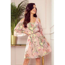 Vzdušné šifonové šaty s rozšířenými dvojitými rukávy, výstřihem a elastickým pasem. Šaty v pastelově růžové barvě se stříbrnou květinovou nití. Značka numoco. Vyrobeno v Polsku.