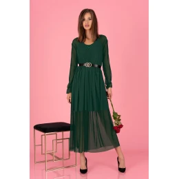 Dlouhé šifonové šaty na dvojitém tylu v krásném tmavě zeleném odstínu. Ideální na svátky i mimo ně. Je vyrobeno z elastických látek, takže je měkké a snadno se přizpůsobí tělu. Hladký překrývající se přední díl, dlouhé elegantní rukávy. Vzdušný, neuvěřitelně ženský styl. Ps. včetně pásu.