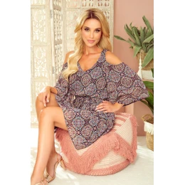Vzdušné šaty s rozšířenými dvojitými rukávy, výstřihem a elastickým pasem. Marocký tmavě modrý vzor. Značka numoco. Vyrobeno v Polsku.