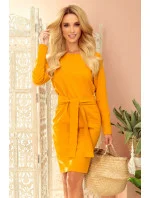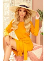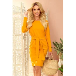 Šaty se širokým páskem, který lze zavázat vpředu i vzadu. Na dotek příjemná tkanina v módní hořčicové barvě. Značka numoco. Vyrobeno v Polsku.