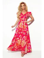 Dlouhé šaty s výstřihem a volánky na ramenou. Šaty v růžové barvě s květy a listy. Značka numoco. Vyrobeno v Polsku.