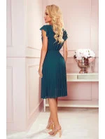 Šifonové šaty s výstřihem a volánky na ramenou. Šaty v lahvově zelené barvě. Značka numoco. Vyrobeno v Polsku.
