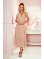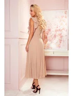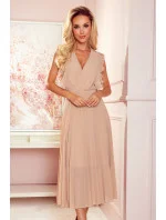 Šaty s výstřihem a volánky. Sukně v módní délce 7/8. Zapínání vzadu na krytý zip. Šaty v béžové barvě. Značka numoco. Vyrobeno v Polsku.