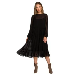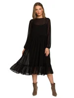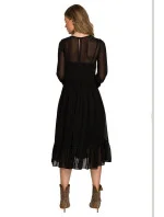 Zde jsou krásné šaty z jemného šifonu, který jim dodává lehkost a jemnost. Šaty mají asymetrický vrstvený lem, který jim dodává originalitu a lehkost. Výstřih ve tvaru písmene V je elegantní a klasický. Guma v pase zvýrazňuje pas a zároveň poskytuje pohodlí. Rukávy v délce 7/8 dodávají šatům moderní nádech. Délka šatů sahá nad kolena, což jim dává univerzálnost pro různé příležitosti. Částečně podšité pro větší pohodlí a správné zakončení. Šaty se skvěle hodí na všechny výlety, večírky nebo setkání s přáteli, kterým dodají na jemnosti a eleganci. Navrženo a ušito v Polsku.