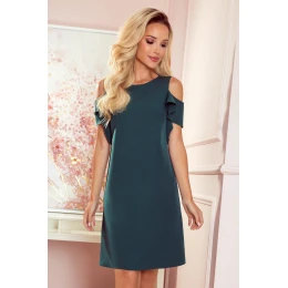 Trapézové šaty s volánky na rukávech a podšívce. Vyrobeno z tkaniny příjemné na dotek (95 % polyester, 5 % elastan). Šaty v lahvově zelené barvě. Značka numoco. Polská produkce.