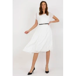 Společenské šaty s krátkými rukávy a kulatým výstřihem. Vzhled dotváří černý pásek v pase. Od pasu jsou šaty nařasené. Návrh ideální pro mnoho příležitostí.