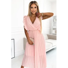 Plisované šifonové šaty s obálkovým výstřihem, volánky na ramenou a zlatým řetízkem. Broskvová barva. Značka numoco. Evropská výroba.