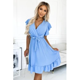 Šaty s obálkovým výstřihem, volánky a zavazováním v pase. Šaty v modré barvě. Značka numoco. Evropská výroba.