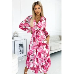 Šifonové midi šaty s obálkovým výstřihem, dlouhými rukávy a páskem. Šaty z růžové růžové látky na bílém pozadí. Značka numoco. Evropská výroba.