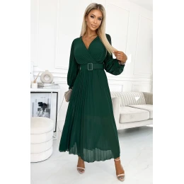 Plisované šifonové šaty s výstřihem, dlouhým rukávem a páskem. Plisování ve výstřihu a na rukávech dodává šatům eleganci. Šaty v lahvově zelené barvě. Značka numoco.